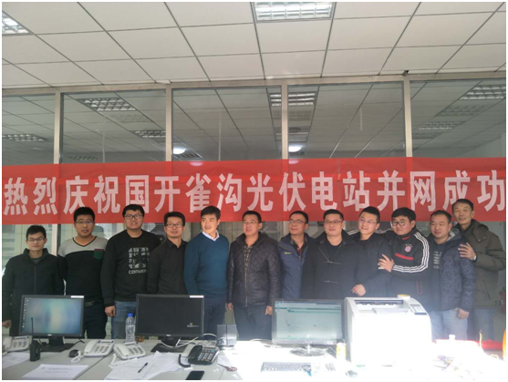 项目地处偏僻的山区,光伏区地形复杂地势陡竣,项目全体人员辛勤付出、抵抗严冬,克服重重阻碍,开山修路,运送设备材料,于12月30日顺利并网。并网当天气温虽低却阳光朗照,在阳光下的映射下,雀沟村西边山坡上的太阳能光伏组件显得格外亮眼,光秃秃的山坡上像是跳跃着一群披着蓝色工装的工人!